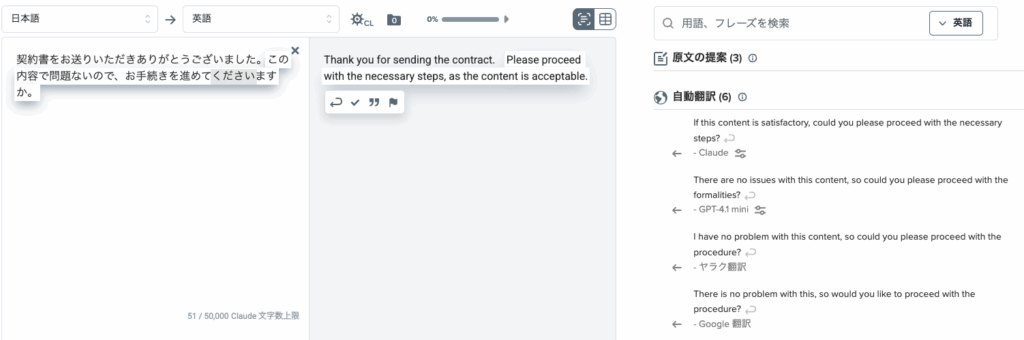 ヤラク翻訳内で複数の翻訳結果を比較・検討できるため、外部サイトで再検索したり、訳文の妥当性を確認したりする手間を削減できます。この「確認作業の削減」が、トータルでの時間短縮に大きく貢献します。