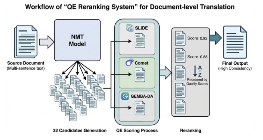 The study investigates Quality Estimation (QE) Reranking, a method in which multiple translation candidates produced by an NMT model are evaluated by a separate AI model that predicts which candidate is the most accurate and natural.