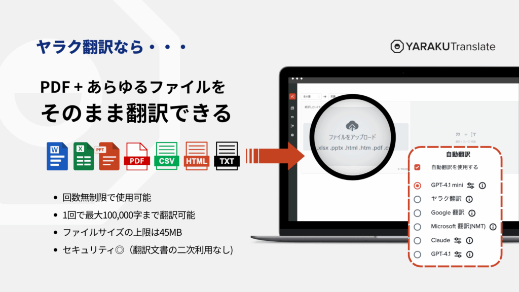 - PDF / Word / PowerPoint ファイルをそのままアップロードして翻訳可能