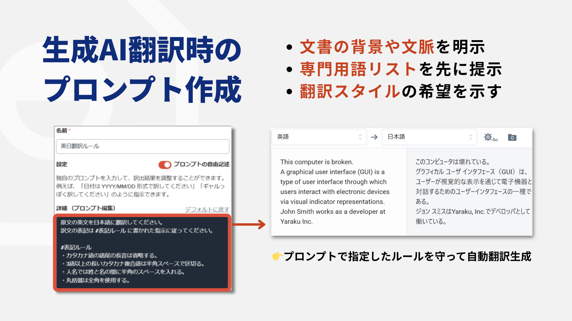 以下では、翻訳の精度を上げるために有効なプロンプトの工夫をいくつかご紹介します。