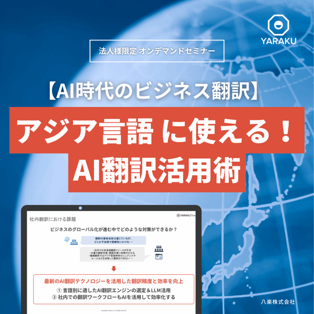 英語とは異なる文法や文化背景を持ち、誤訳や違和感が生じやすいアジア言語。「翻訳に時間がかかる」「品質が不安」「社内用語が伝わらない」そんな課題を感じている方におすすめです。オンデマンド視聴はこちら