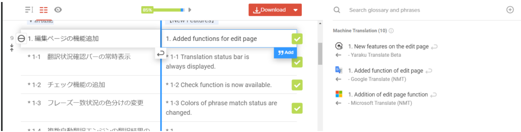 「機能追加」の「追加」という部分に対し他3エンジンは「additional」、「added」、「addition」などと訳している中、ヤラク翻訳は「New features」と訳出しています。
