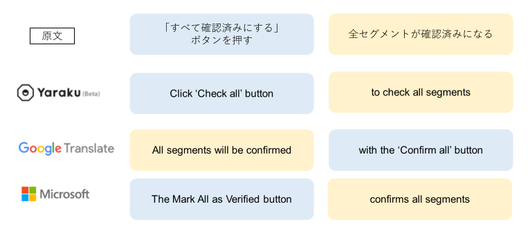 まず、「確認」という語彙に対する訳語が「comfirm」「check」「verify」など様々でした。そして、語彙よりも少し大きな文節の単位で見ると、「すべてを確認済みにする」という、原文では前半にあたる節を訳文で後半にもってきているのはGoogleのみでした。