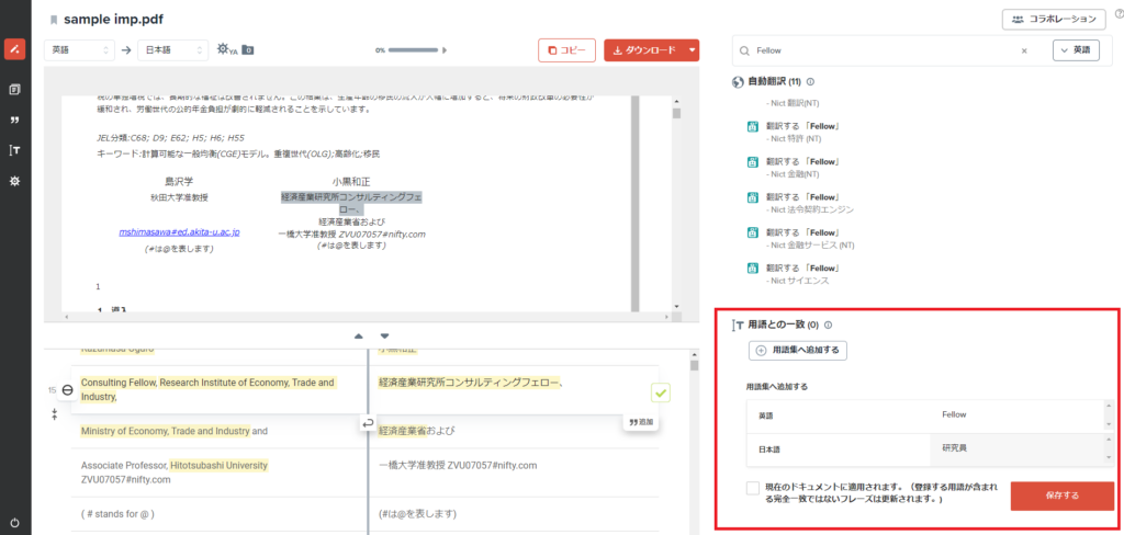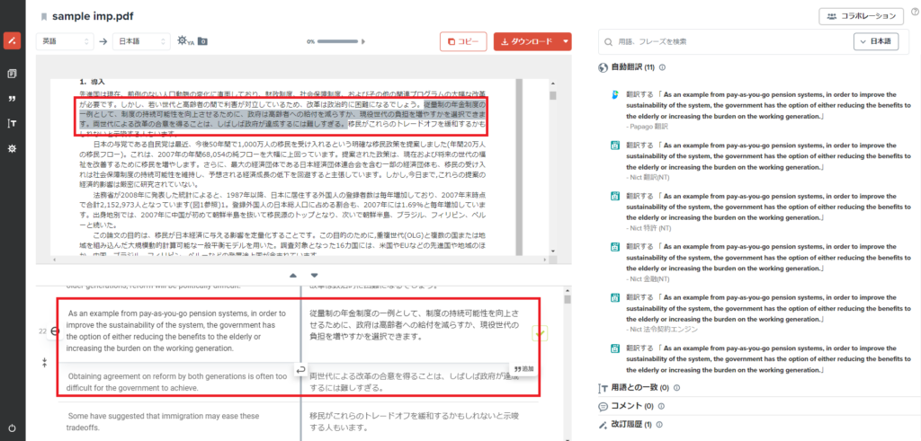 上の画像のように、翻訳後の画面では原文と訳文が横に並んで表示されます。カーソルを合わせるだけで対応する文章がハイライトされるため、翻訳が正しいかどうかの確認や修正(ポストエディット)が直感的に、かつ素早く行えます。