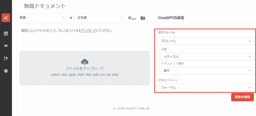 しかし「ヤラク翻訳」では、上の画像のように「学術レベル」「分野」「ドキュメント種別」などを選択するだけで、最適なプロンプトが自動的に適用される仕組みになっています。