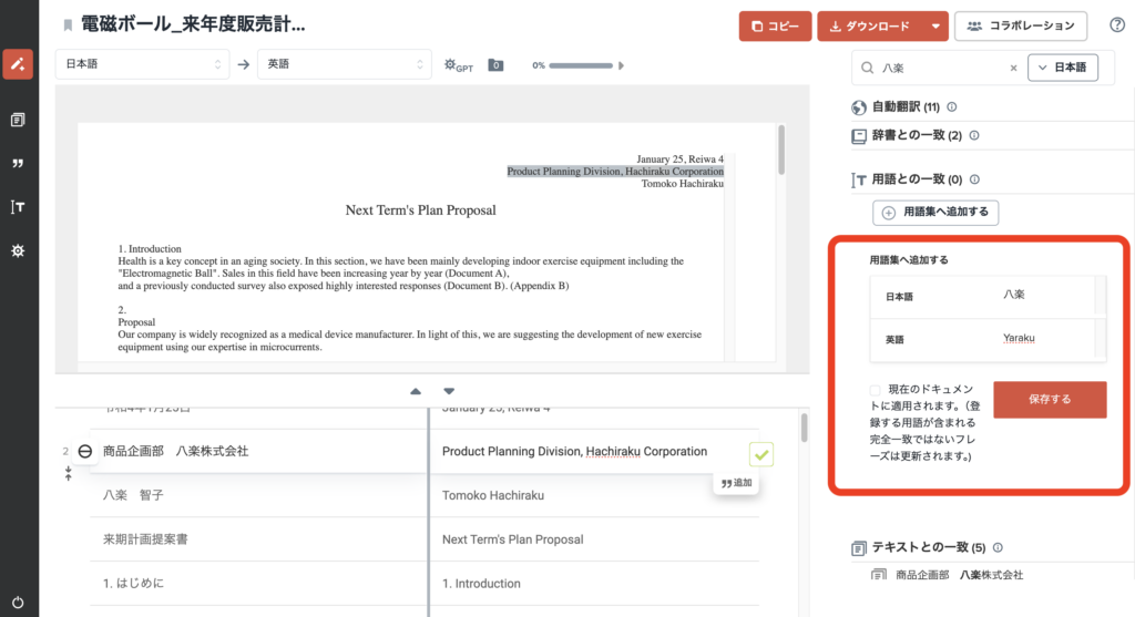 ヤラク翻訳には、用語集やフレーズ集を登録する機能があり、特定の用語やフレーズをカスタマイズして翻訳に活用できます。特に特許文書には専門用語が多く含まれるため、一般的な翻訳エンジンでは正確な翻訳が難しい場合がありますが、用語集を使うことで専門用語の誤訳を防ぐことが可能になります。また、学習機能により、ユーザーの翻訳スタイルや選好に基づいて翻訳エンジンが自動的に改善され、翻訳精度が継続的に向上します。この機能により、専門的な知識を持たないユーザーでも高品質な翻訳が実現できます。