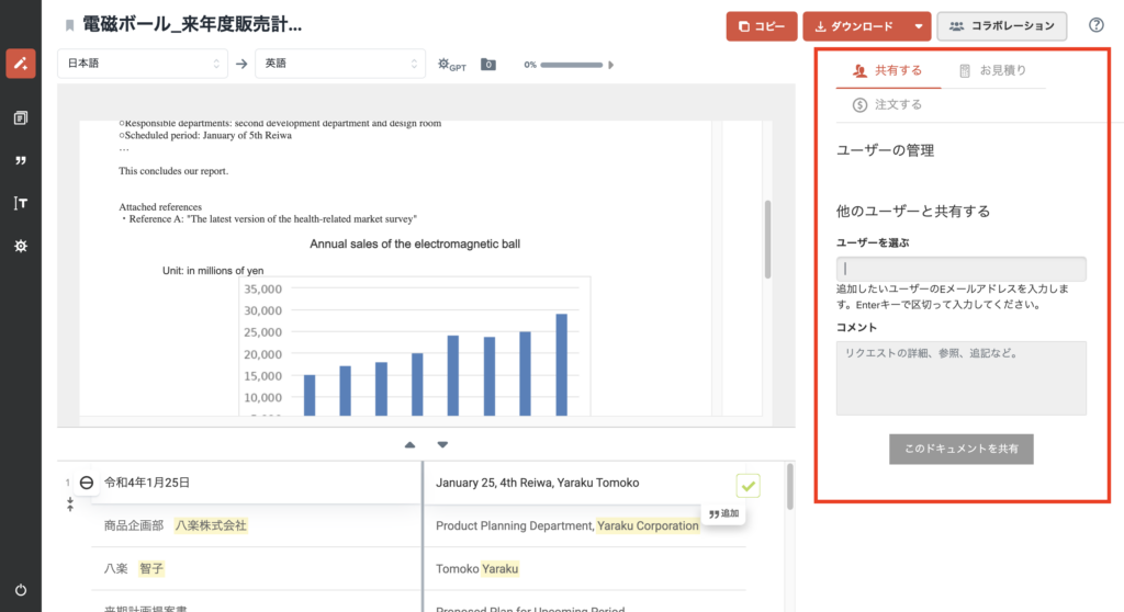 翻訳文書の共有と共同編集を可能にする新しいコラボレーション機能を提供しています。ユーザーは、翻訳中の文書を他のユーザーと共有し、同時に編集することができます。例えば、文書内に専門的すぎて分かりにくい表現などがあっても、簡単に技術担当者にシェアすることが可能です。