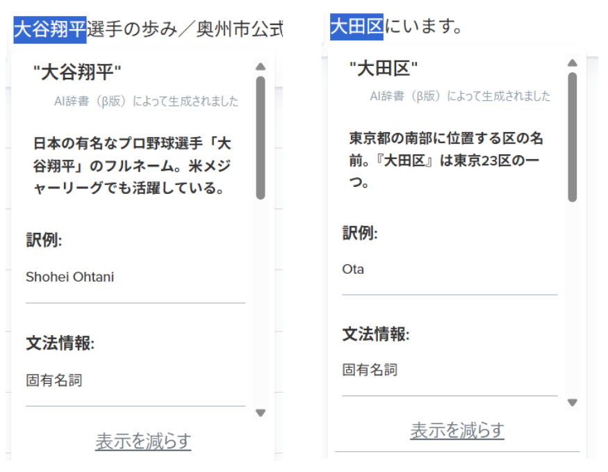 この方法で検索した場合は、辞書情報がサイドパネルのAI辞書セクションに表示されます。