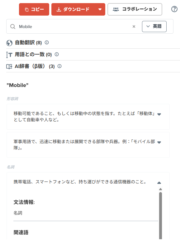 新しいAI辞書機能は、AIが単語に関する辞書情報を生成します。