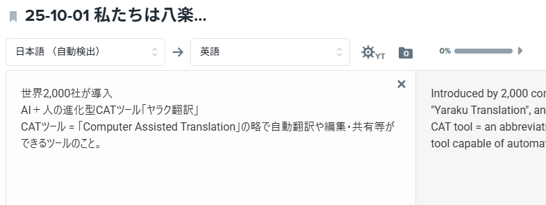 八楽は、ユーザーの皆様によりよい翻訳支援ツールをお届けするために、ヤラク翻訳の定期的なアップデートを実施しています。定期アップデートでは、皆様からいただいたご要望への対応や、最新技術の導入、翻訳の精度向上、UIの改善などを実施しています。