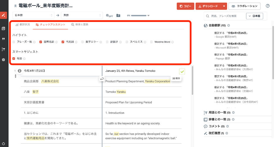 ヤラクゼンは、一つのプラットフォームで翻訳から編集までを一貫して行うことができます。チェックアシスタント機能により、翻訳言語に不慣れな方でもスムーズに編集が可能です。翻訳後後の結果を見てどこを修正すればよいかわからない場合でも、AIが自動で問題点を指摘し、修正が必要な箇所を明確に表示します。これにより、誰でも簡単に修正作業が行えるようになります。