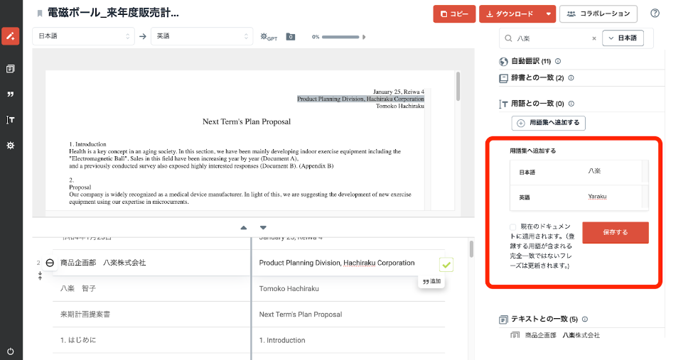 ヤラクゼンでは、用語やフレーズを事前に登録して翻訳の精度を高めることができます。特定の用語やフレーズが現れると、それらを用語集に追加したり、指定した翻訳を自動的に適用することが可能です。