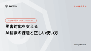 Download お役立ち資料 災害・防災の翻訳で失敗しないために 緊急時や災害時に、在留外国人の方にもすばやく情報伝達するためには自動翻訳が便利です。しかし、便利である反面、リスクもあります。 迅速に正しい情報を伝える … 続きを読む 災害対応を支えるAI翻訳の課題と正しい使い方
