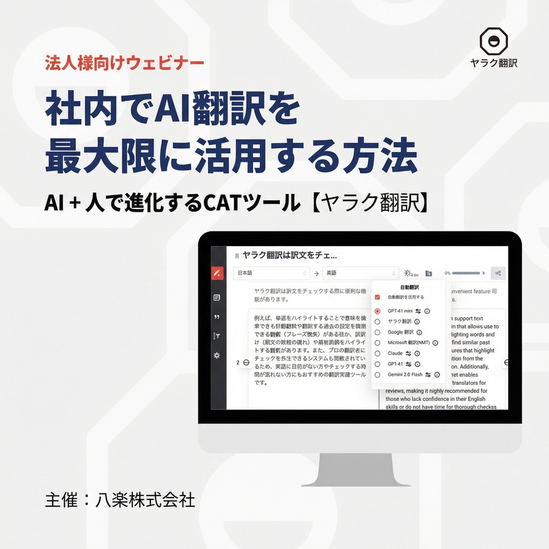 Seminar 無料オンラインセミナー AI自動翻訳・オンライン翻訳プラットフォームのヤラク翻訳では、法人様向けオンラインセミナー(ウェビナー)を定期的に開催しております。ぜひ八楽のオンラインセミナーに参加して業界の第一人者の意見を参考にし、今後の翻訳へ取り組みに活用してください。 閲覧可能なセミナー 常時配信【今すぐ視聴できます】 高品質な翻訳と業務効率化を両立! 社内でAI翻訳を最大限に活用する方法 セミナー詳細ページへ
